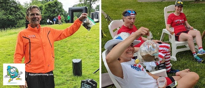 We set up three Zero Hero tents at Flirt with Dirt – two in the finish area, and one by the bathrooms and covered picnic area, where runners had disposed of quite a bit of waste last year on the way to the parking lot. At Liberty, we set up three tents in the finish area and one across the road where runners had left many water bottles on the grass in previous years. At both races we had a bin for plastic bags and wrap in the finish area.