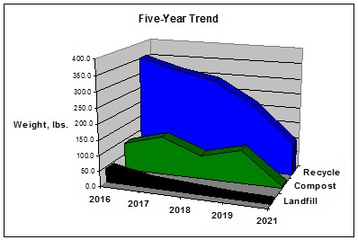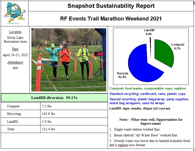 In addition, Trail Marathon Weekend was the first RF Events race to go Zero Waste, back in 2016, so it is also the first event where we have five years of data. The trends show a general reduction not only in landfill waste, but in all waste categories. Some of this is due to going cupless, as well as a general reduction in materials used.