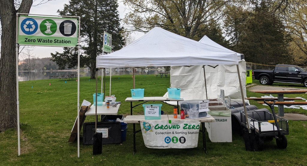We continued the experiment of not using multiple waste stations and went with a single pavilion. And instead of labeled bins, we put out boxes labeled “All Waste” and the Zero Waste team did the sorting. This model worked very well both days. The only bags to sort were from the aid stations, which were taken care of relatively quickly, helped by a reduction from three aid stations on the course to two.
