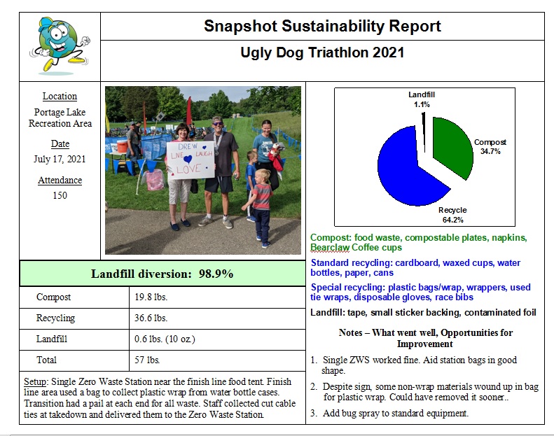 The race followed the same format as last time (2019), with several duathlon/triathlon options offered, and the post-race food was the same – pancakes, egg & cheese wraps, bananas, and “puppy chow” Chex-style treats. Missing this year was the Ugly Dog Distillery offerings, except for tiny bottles as (over 21) age group awards. However, the Zero Waste strategy was quite different.