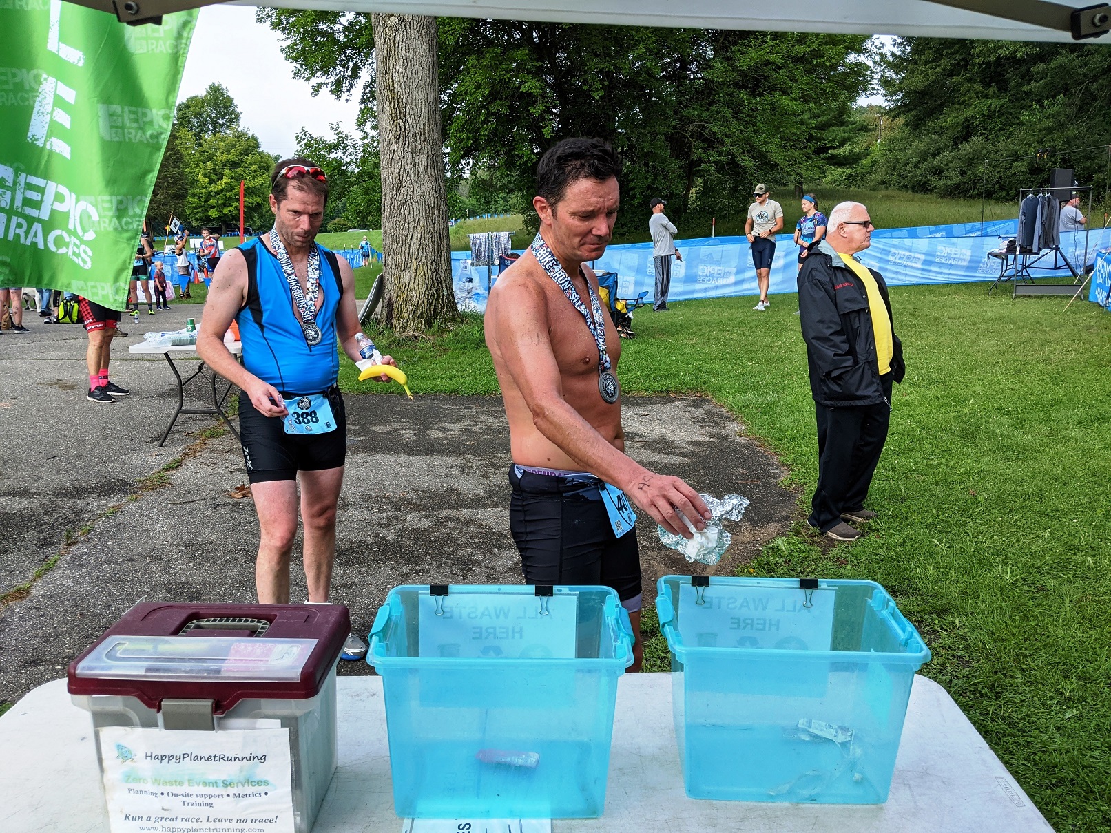 Transition had a pail at each end, and the finish line had a bag for plastic wrap from medals and cases of water bottles. The food tent also had its own “all waste” box, which was periodically swapped out by the Green Team. The team taking down transition at the end of the event got a dedicated pail for cut tie wraps (used to secure the fencing to its poles).