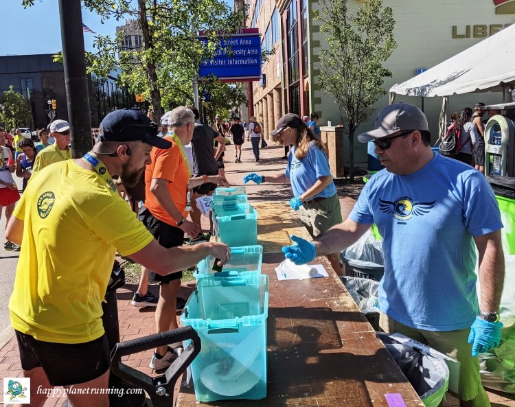 Challenges included people using existing City trash cans. We covered the big ones, but a couple escaped notice at first and were cleaned out and sorted. And, as usual, the aid station bags had to be carefully sorted to remove Gu packets and other contaminants from the bottles and cups.
