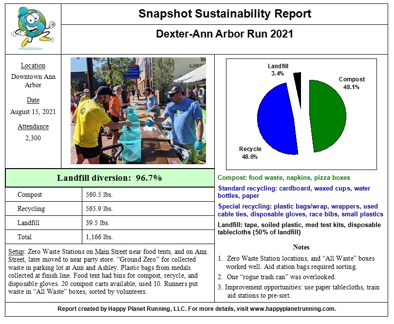 The Dexter-Ann Arbor Run is one of Ann Arbor’s longest-running events. This is the 47th year of the event, and the third using a Zero Waste approach. Once again we achieved over 90 percent landfill diversion, officially making it a “Zero Waste” event per ZWIA guidelines!
