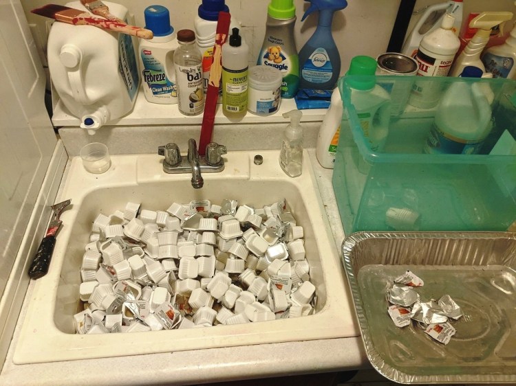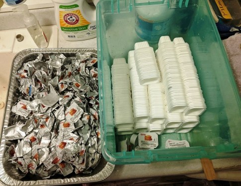 Challenges included lack of volunteers (thanks again to my friend Debbie for all her help), yellow jackets bingeing on syrup, and the individual syrup packets. Chris Cakes went away from pump jugs due to CDC guidelines, they said. So we tossed them all into what I thought would be an extra landfill bucket. No way we could get them clean enough to recycle. Right? Ummm…..right, Jeff?