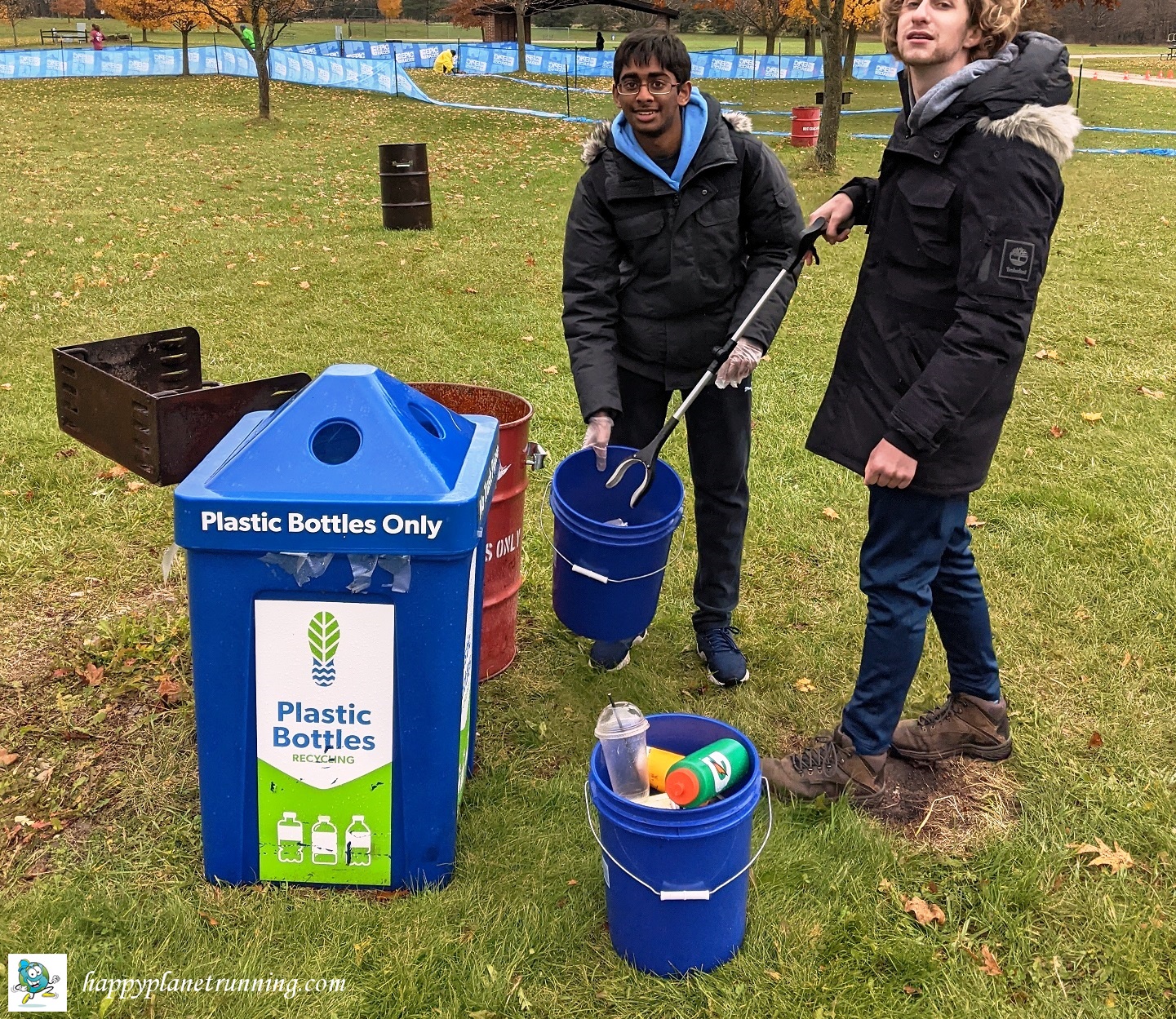 In previous years we have replaced park trash cans in the race area and building exits with our own bins. But the park had set out so many trash cans and recycling containers that I changed the plan. I moved those in the finish and food area but left the ones at the starting line and the exits to the parking lot in place, periodically policing them to remove race waste. This saved time and effort, and we helped out the park by sorting out non-recyclables from their recycling bins.