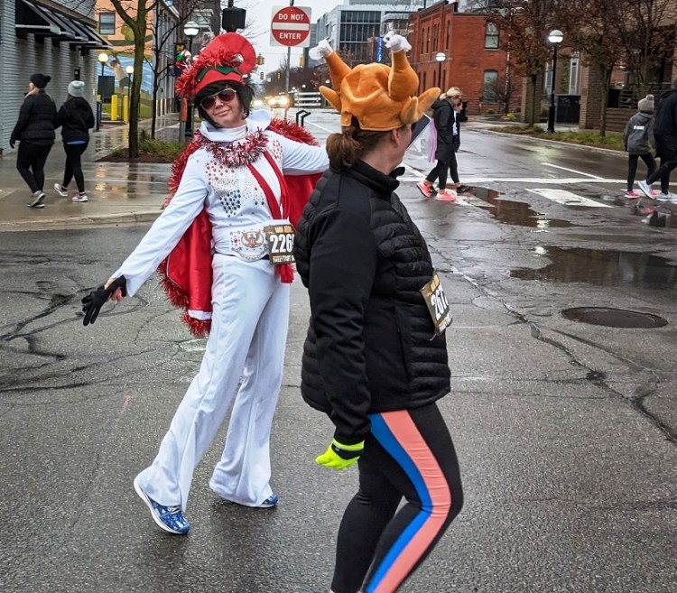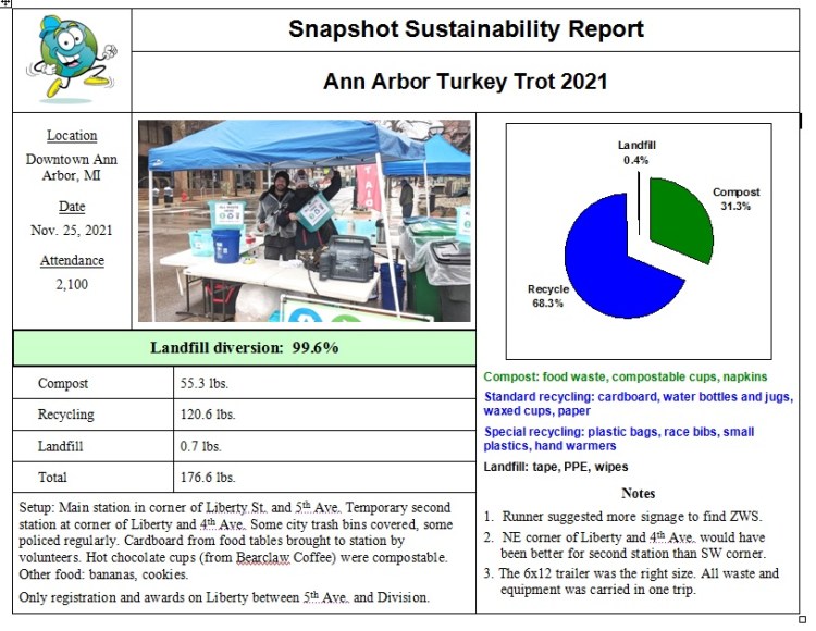 Despite a chilly rain, the downtown Ann Arbor Turkey Trot 5K and kids run took place on schedule, with a good crowd on hand. And despite the conditions, the Zero Waste Team had its best Turkey Trot to date, with less than one pound of landfill!