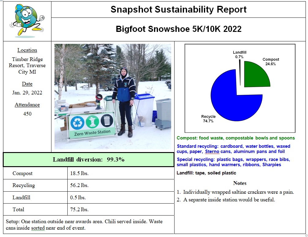Water bottles, paper, cardboard, and Sterno cans were recycled, as were the aluminum chili serving pans, after rinsing. Landfill consisted of soiled cracker wrappers (clean ones got recycled), cling wrap, and duct tape. Discarded race bibs, Gu and snack wrappers, marking ribbons, and hand warmers were saved for TerraCycle.