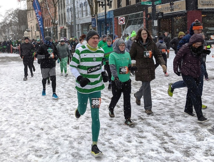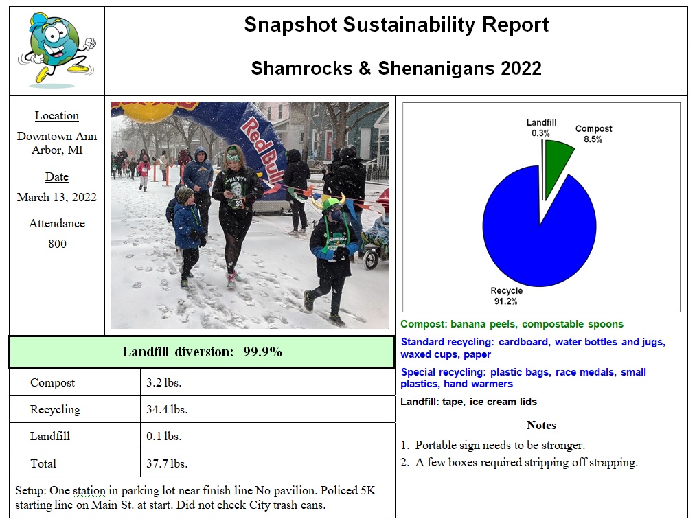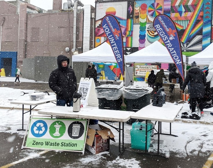 The Shamrocks & Shenanigans 5K took place on a day where, unofficially at least, spring took over. But that was in the afternoon. Race morning was a final blast of winter fury – cold, windy, and snowing. Still, the show went on, and lots of brave, green-wearing souls showed up to run, so the Zero Waste team was there too. Gotta job ta do, laddies!