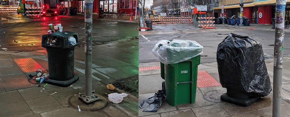 One cleanup was needed before I even set up. The City trash can at State & Liberty, where runners would be lining up, was stuffed full, with more trash spilled around it. I cleaned it up and covered the can to avoid a further mess. I also picked up litter on Liberty up one block beyond the starting line. (The landfill from that cleanup is not included in the race totals, as the race didn’t generate it.)