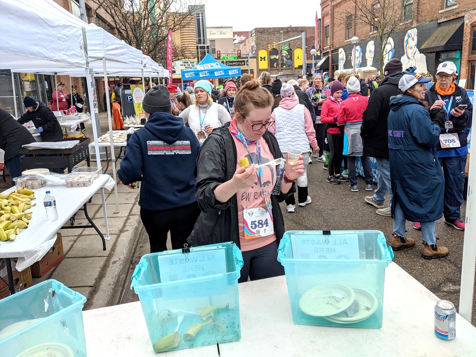 Post-race food was warm fruit crepes, salad, cinnamon rolls, and bananas. The plates, forks, and cups were all compostable, making that part simple. Recycling came from cardboard, water bottles, plastic bags, and cups from nearby coffee shops.