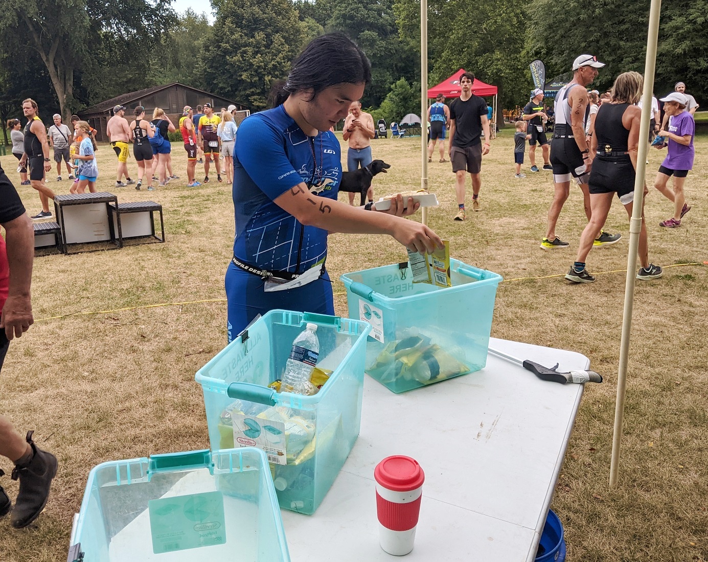 As usual, the main Zero Waste station was between the registration and volunteer tents, with a small second station in the post-race party area. All Waste boxes were put at the two transition area entrances/exits and swapped out when needed.