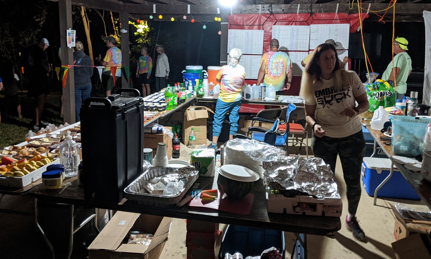 Thanks to my volunteers Julia, Fred, Darin, Shawn, and Sue, and my staffers Rachael and Debbie. I need to give special thanks to my Saturday afternoon and evening crews. That time period is usually when we catch up on aid station bags, but the flow of campers to our station was nearly endless, and being up nearly 48 hours straight didn’t help my mood. But that evening we did catch up, to my surprise and relief. Special thanks to my wife Joyce, who came over to help Saturday for a little while and would up staying most of the day. In addition to a lot of cup sorting, she kept me on a (reasonably) even keel emotionally when things got hairy.
