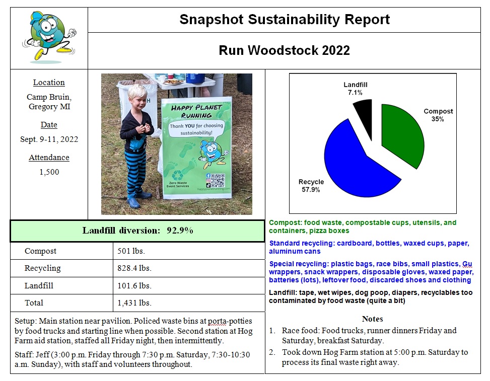 Sunday morning, far from the frantic sorting party of previous years, went smoothly. With Hog Farm already processed, the final aid station bags coming in Saturday night were managed easily. With a good-sized team of experienced Zero Waste volunteers, I was able to make a run to the recycling center, get everything else sorted and weighed, and wrap up by 10:30 a.m., beating our usual Sunday finish time by several hours.