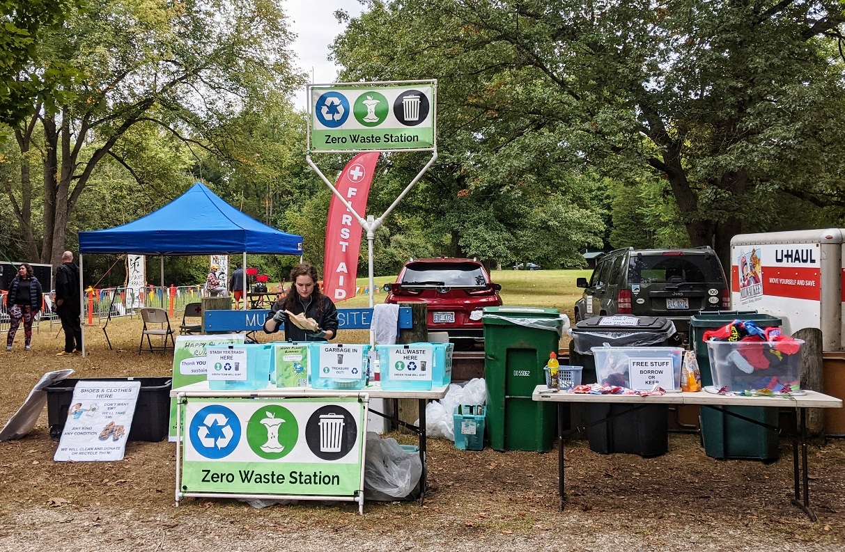 The main Zero Waste station was set up across from the pavilion and hot dog truck. There was a small aid station for the solo ultrarunners near the pavilion, which we set two All Waste boxes at, changing them as they filled up. The runners had no trouble finding us, and we got many questions and compliments!