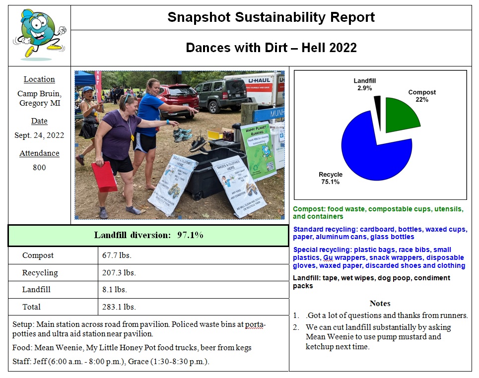 The post-race beer changed from cans to cups from kegs, so we had a lot fewer deposit cans and bottles, meaning recycling weight dropped dramatically. Compost increased slightly, but still way down from 2019 and earlier with the switch from pizza to hot dogs. Landfill consisted mainly of non-compostable wet wipes, and lots of mustard, ketchup, and relish wrappers from Mean Weenie. If they can go to pumps next time we’ll cut the landfill significantly.