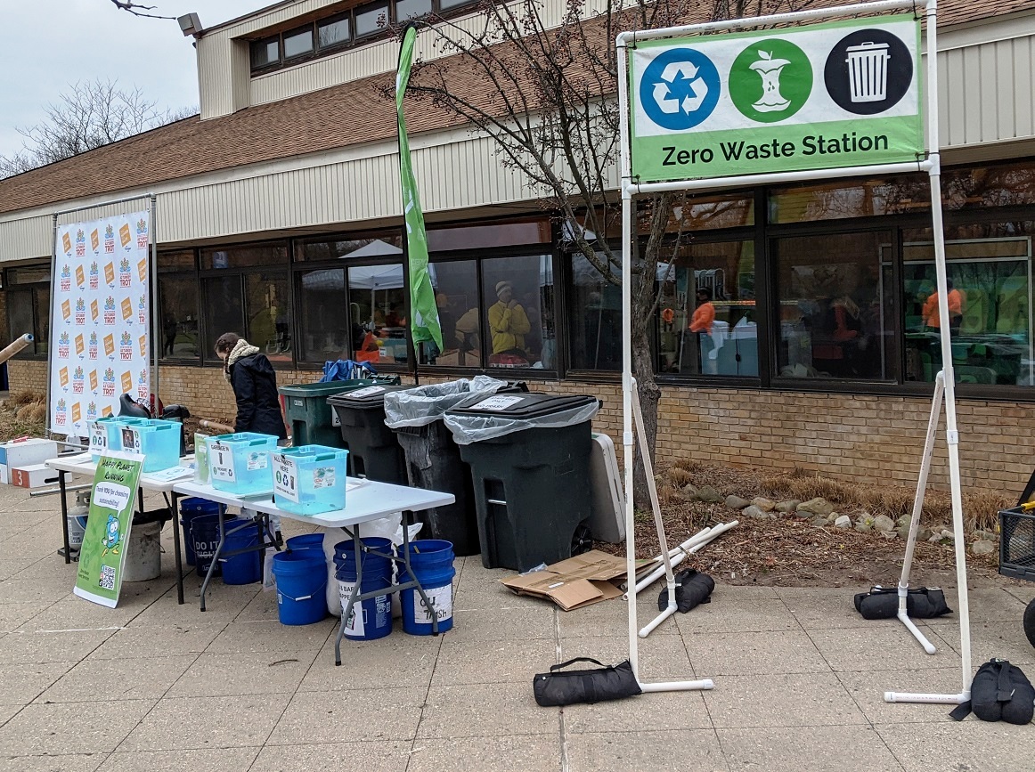 Grace and I set up the Zero Waste Station on the concrete patio across from the food tables. It was a cold morning but with very little wind, so we didn’t bother setting up a canopy. We also tested out my new sign brace, although with little wind it wasn’t challenged much.