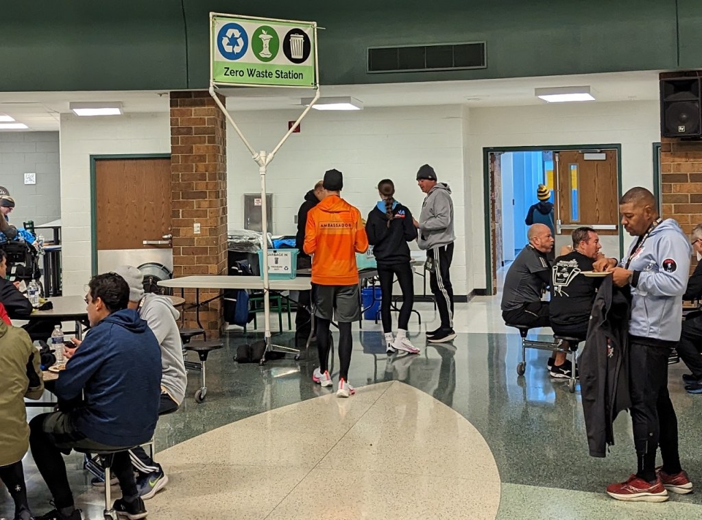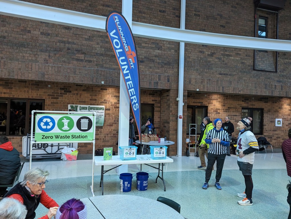 Outside at the finish line there was only some cardboard and plastic wrap from water bottle cases, which they dropped off near the entrance, along with the aid station cups and jugs.