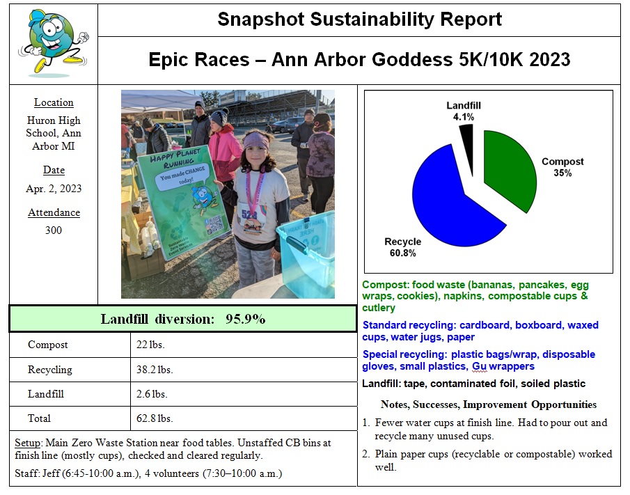 Epic Races kicked off its 2023 season on a beautiful April Sunday morning with the Ann Arbor Goddess, an event that has raises money for women-focused charities. And once again, Congressional representative Debbie Dingell was handling out medals at the finish line. With multi-generational attendance, it was that much more important to set an example of good environmental stewardship, and the Green Team was up to the task.