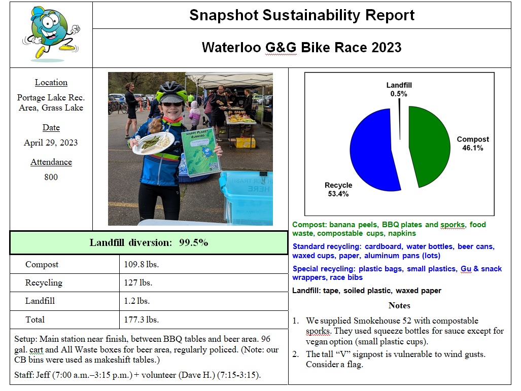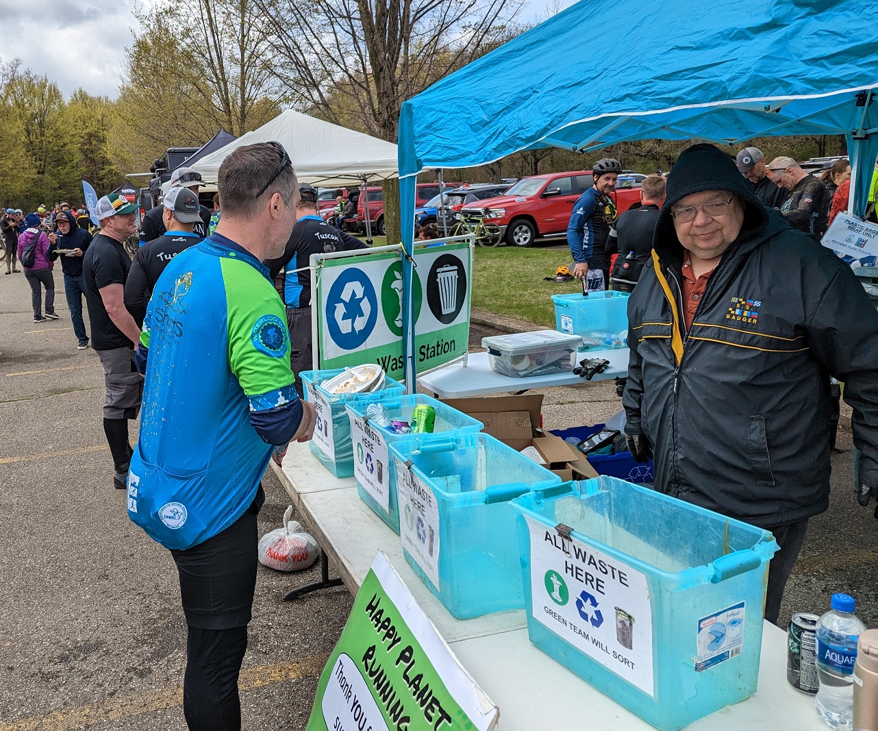 Tris4Health kicked off their race season with the Waterloo G&G race in the Portage Lake Recreation Area. This is a gravel bike race offering 50K and 100K distances, including a trip through a working gravel pit(!). And for those looking to get in a quick fun ride, there’s a non-competitive 10-mile option. And all of it Zero Waste!