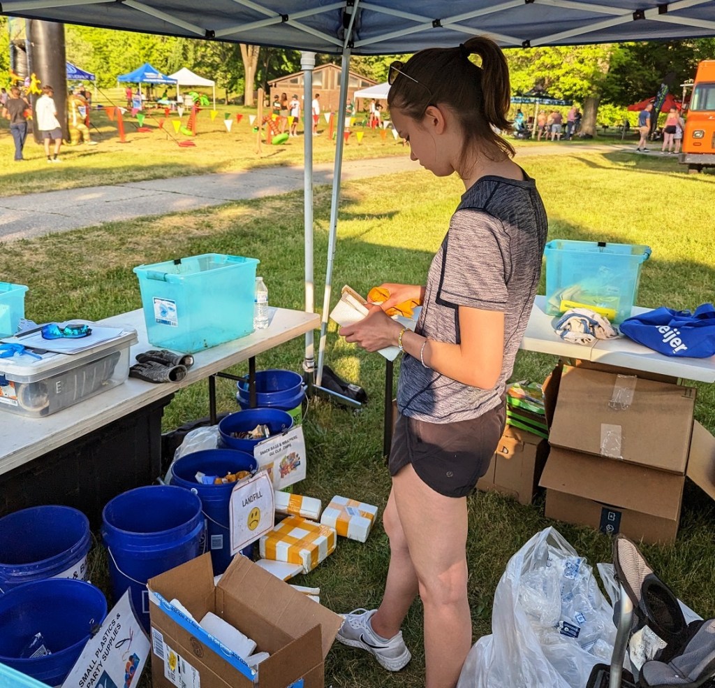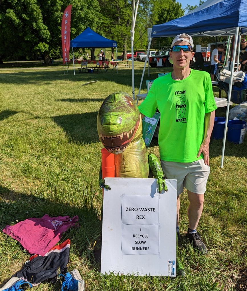 Landfill was the usual suspects – tape, soiled waxed paper, and lots of those tiny, shiny tabs from wristbands that are a b***h to pick up all over the registration transition areas. But once again, we had less than one pound to send there, which meant the park trash cans were empty when we left. Except for one at the far end of the park, which did collect some race waste. Maybe next time, if we have the bandwidth!