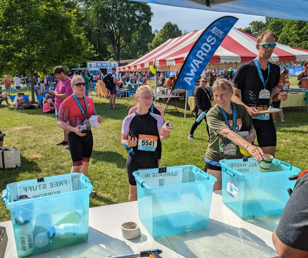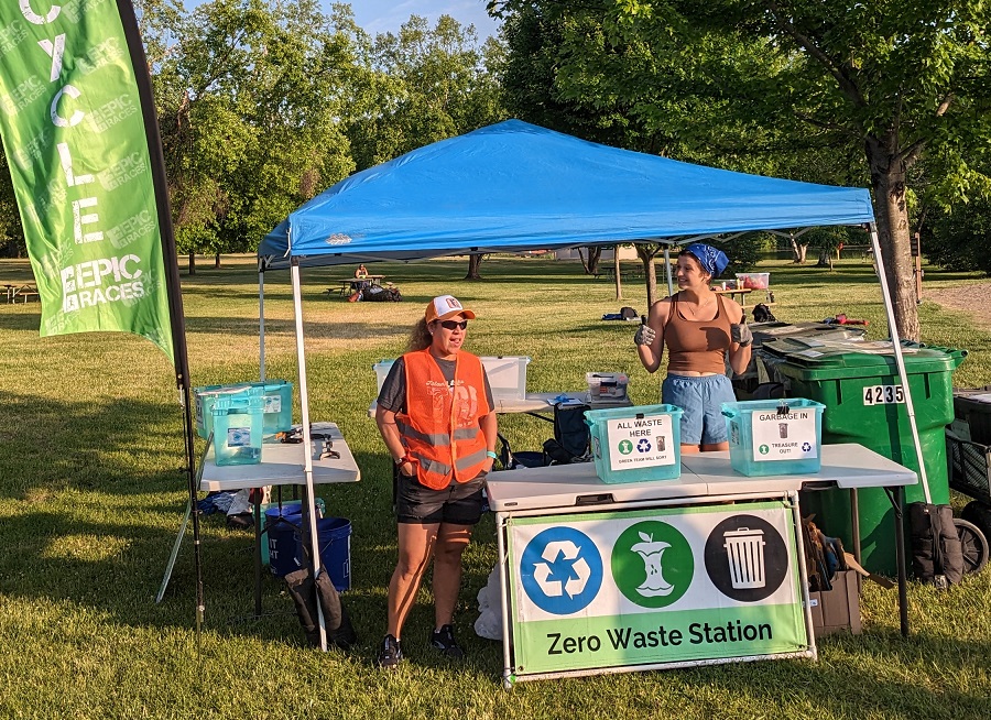 We set up the main Zero Waste station by the food tent and entrance to the beer area, and a second unstaffed station on the other end. The beer area got a bin for cans and an All Waste box for other stuff. Each exit from transition got an All Waste box. The food prep area was policed regularly but had a bunch of unsorted waste at takedown, so extra checking closer to takedown would help.
