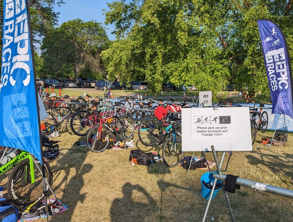 Transition had less litter than last year. However, there were still a bunch of the tiny plastic tabs that come off the athlete ankle tags that had to be picked up off the ground one by one. It would be great if we could find a way to have the athletes drop them in a pail on their way out of transition. Signs plus announcements?