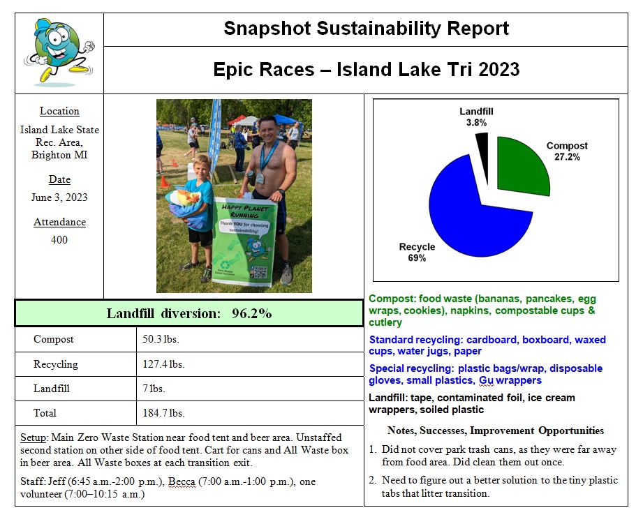 This year’s Island Lake Tri was a warm one, so the ice cream freezer got hit hard. But the athletes were in fine form, and everyone seemed to have a good time. And the Happy Planet Running team was there to make all that fun sustainable.