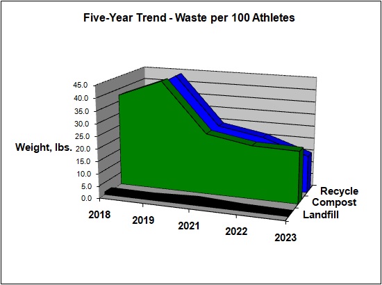 These improvements, with others, resulted in another drop in waste per 100 runners – a downward trend since 2019 – and a record low 15.8 lbs. going to landfill out of over 1,100 lbs. total waste. Everything else was recycled or composted. And our total recycling dropped by over 100 lbs. – a reduction of nearly twenty percent!