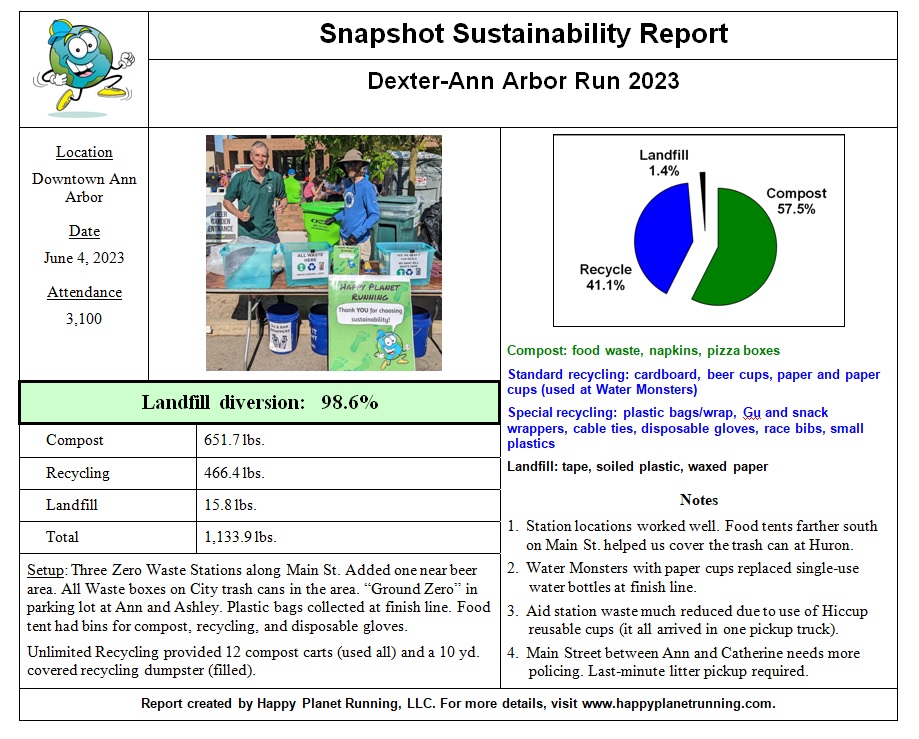 Everything about the way this race is organized and put on is something the Ann Arbor Track Club can be proud of. And the continuing investment in making it sustainable is worth bragging about. With a landfill diversion rate consistently over 95 percent, it sets a model for a world-class Zero Waste event.
