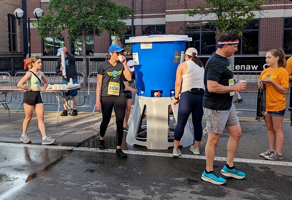 The two biggest changes were replacing disposable cups at the water stops with reusable silicone cups from Hiccup Earth, and replacing water bottles at the finish line with cups filled from two Water Monsters. And because they were filled with city water from a tap, there was no need to purchase water in jugs, saving even more material. The significant investment by the race in these improvements was well received by the runners, and much appreciated by the Green Team. To the Ann Arbor Track Club and race director Clint McCormick, thank you! And extra thanks to the Ann Arbor Office of Sustainability and Innovation, which funded the Hiccups!