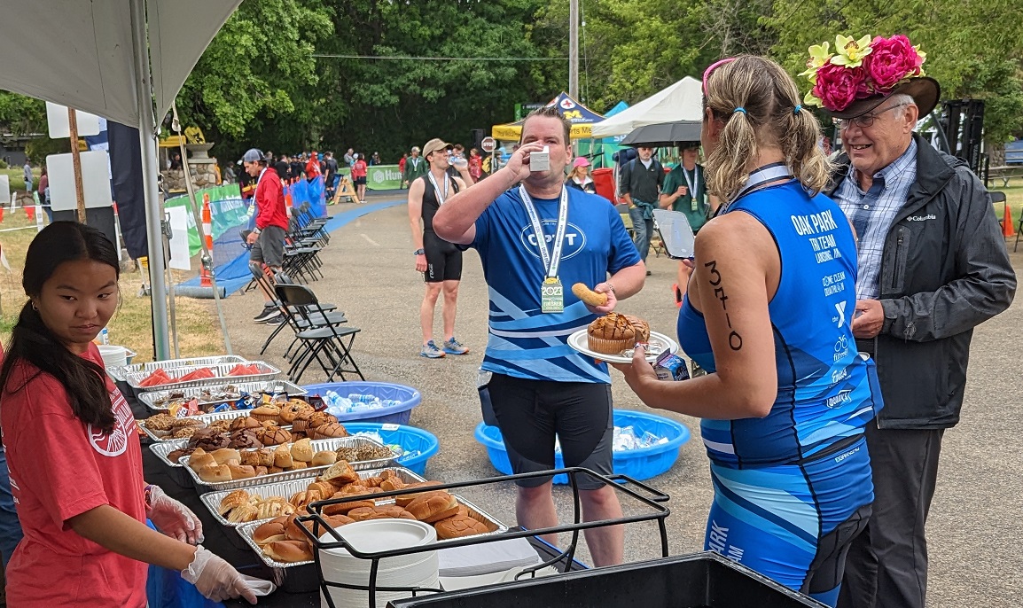 Food was varied and plentiful. A variety of pastries were available in the morning, with pizza and BBQ later on. Bananas and watermelon were popular, as were the little snack bars. We supplied the event with compostable plates and sporks per Tris4Health request. (We did not supply the hat in the photo below.)