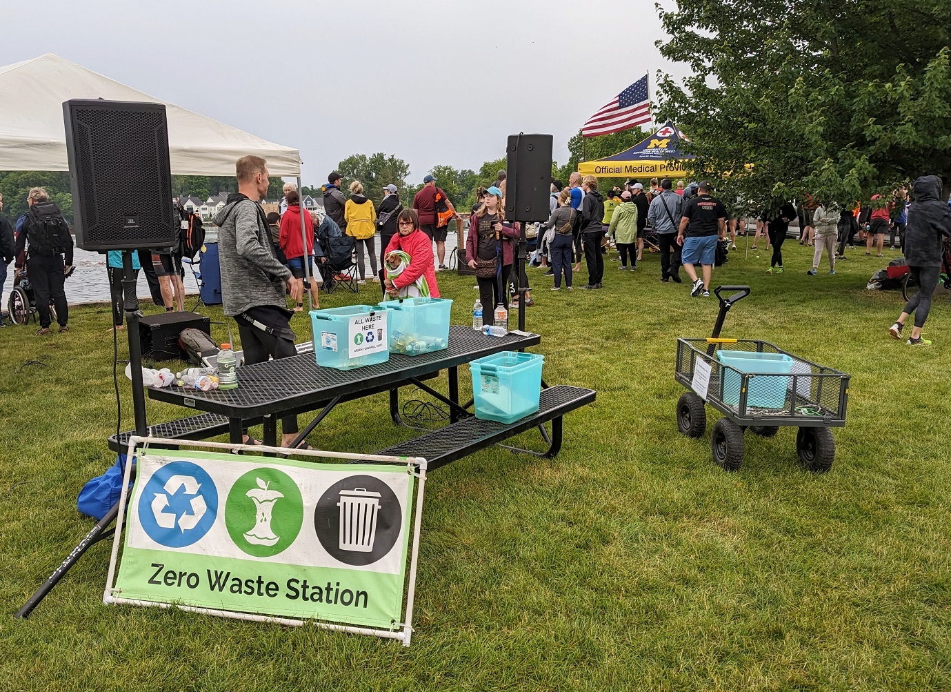 We also needed a station at the swim start. Four All Waste boxes on a couple of tables did the trick. The start was about a quarter-mile walk from the finish. It would have been best to have a Green Team member down there until it wrapped up, but this year we had to settle for periodically going down there to swap boxes.