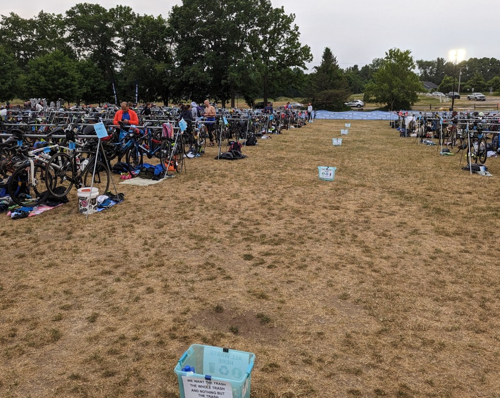 We put just two waste bins in transition on Saturday, which turned out to be insufficient. On Sunday the staff took six of our All Waste boxes and ran them down the center of transition. This worked really well, as they were easily visible and easily swapped out. There was also one box at Bike Out, which moved to Run Out later in the day.
