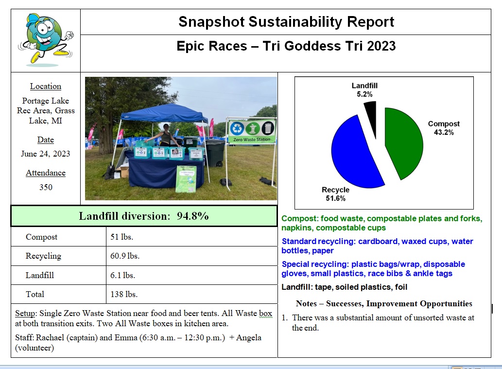We set up our Ground Zero Waste Station near the finish line by the food tent as well as placing zero waste bins near the transition area and food tent. At the end of the event, we received a few aid station bags as well to sort and weigh.