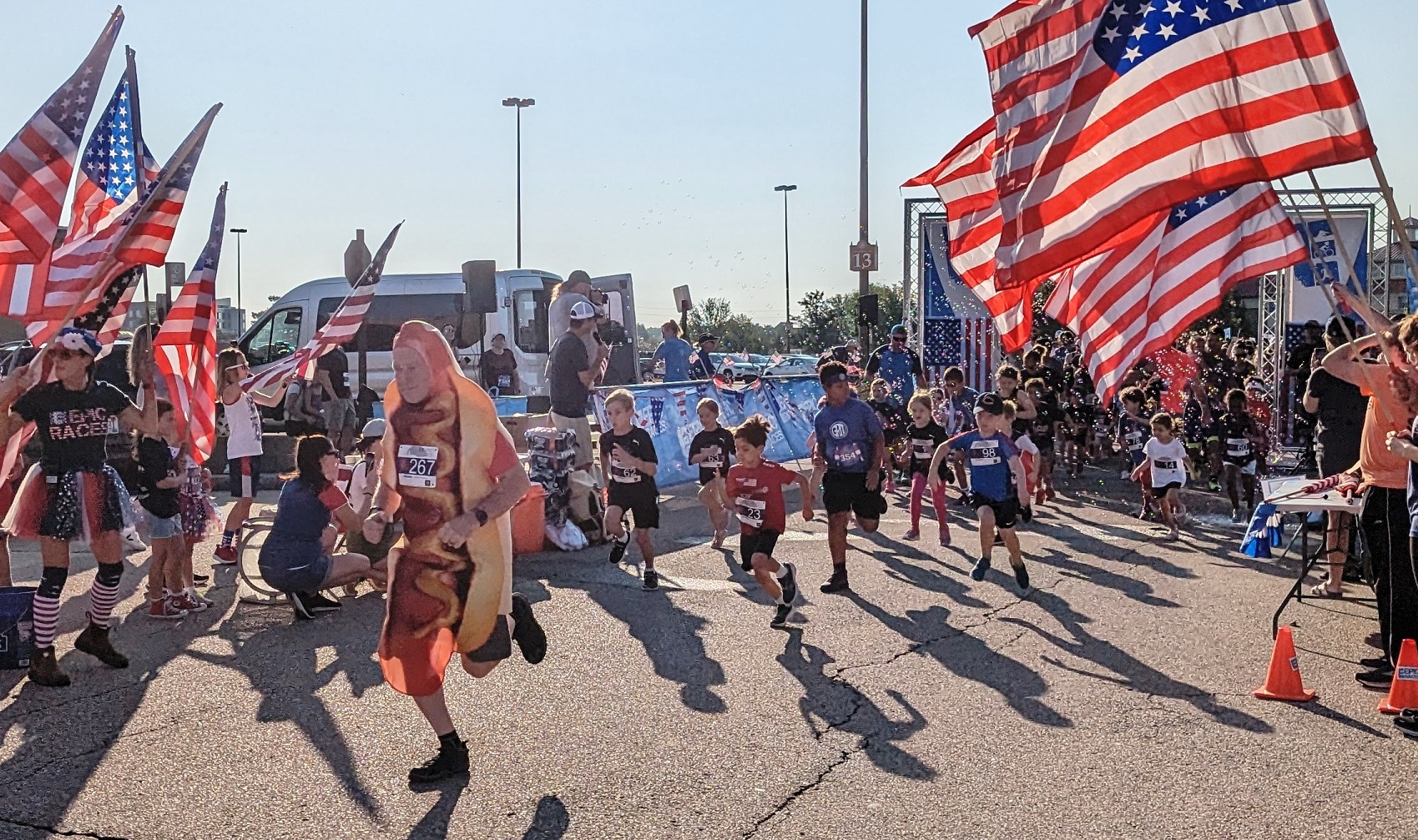 The hot dog division (eat four hot dogs in 76 seconds, then run the 5K) was back, as was a one-mile run and a 200-yard kids dash, led by Larry the amazing human hot dog!