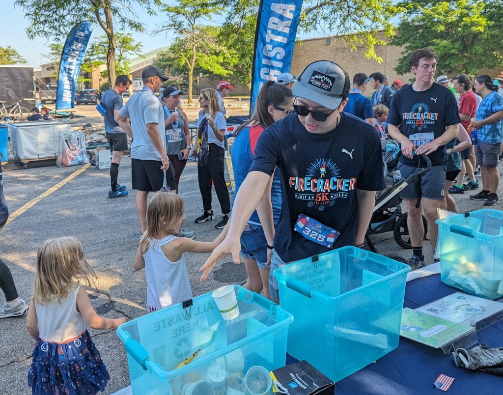 Food was the hot dogs (for the contestants), bomb pops, and bananas. Bomb pop wrappers went to TerraCycle, and sticks were composted. Recyclables were water bottles, cardboard, paper, and plastic wrap from medals and water bottle cases. The aid station waste was nearly all water jugs and compostable paper cups, so it was easy to process them.