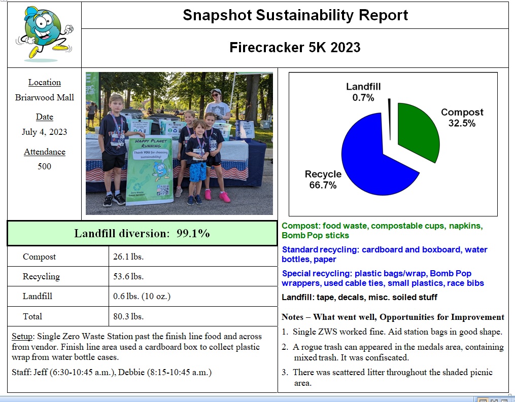 Recyclables were up a bit from last last year, while the amount of compostables was nearly identical, so total waste increased a little, not surprising with over 100 more runners this year. However, waste per 100 runners has been in a consistently tight range for the past five years.