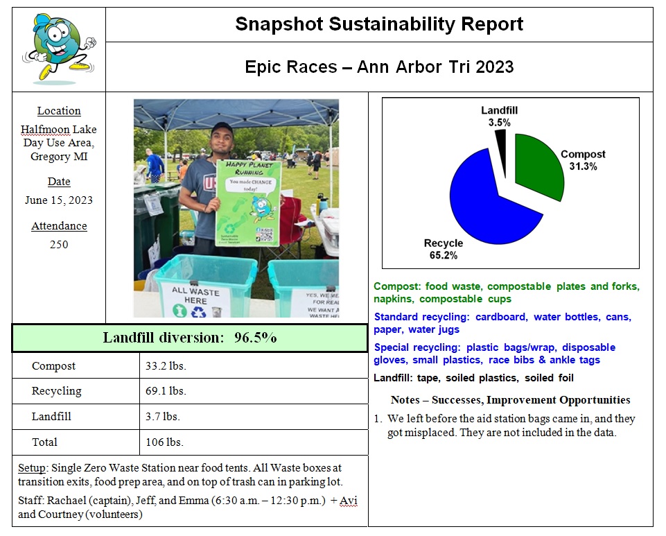 Waste at the transition area and near the finish line came to 106 lbs. with only 3.7 lbs. going to the landfill! Unfortunately, the aid station bags weren’t collected until after the team had to leave, and a communication mixup caused them to be discarded. Oops! So they aren’t included in the data. Also at the end we received a dreaded “rogue trash can” set up near the finish line and filled with mixed waste we had to sort. Got to be more vigilant, and communicate more with the crew!