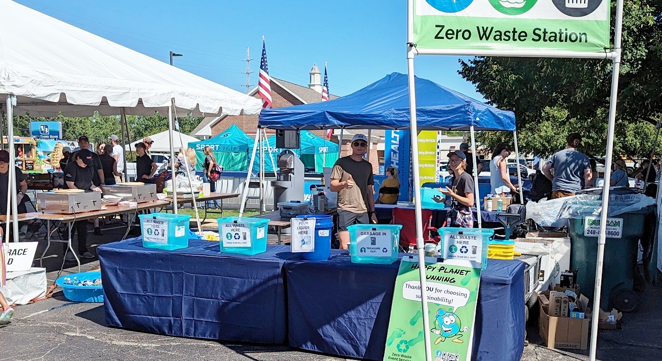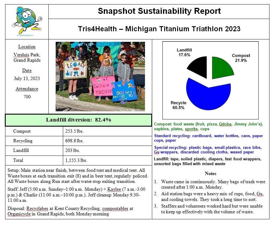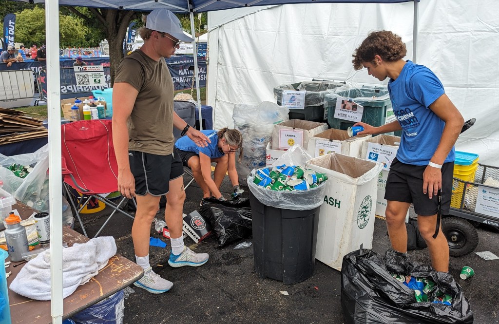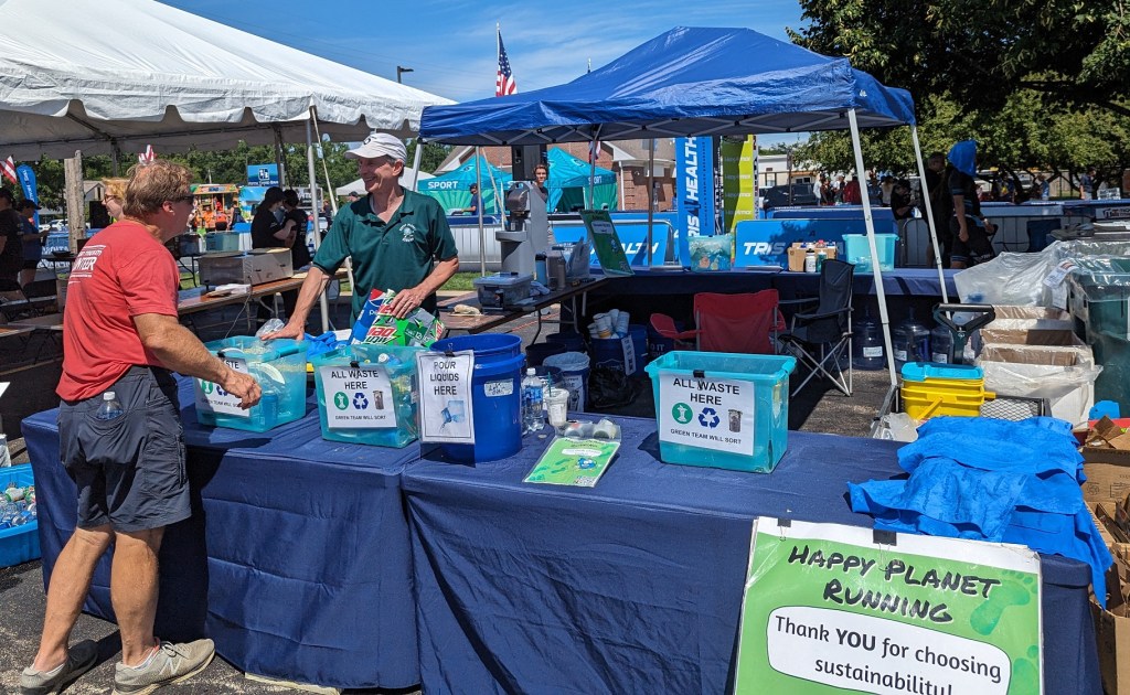 Well, what a day (and a half) for Happy Planet Running at the Michigan Titanium Tri. With 700 athletes doing their choice of sprint, Olympic, half, and ultra (a.k.a. “Ironman”) distances, there was an incredible amount of energy expended at and around Versluis Park in Grand Rapids. And all that effort needed recovery and refueling, resulting in lots of waste to responsibly process. I can’t say I did a triathlon, but I sure got my steps in.