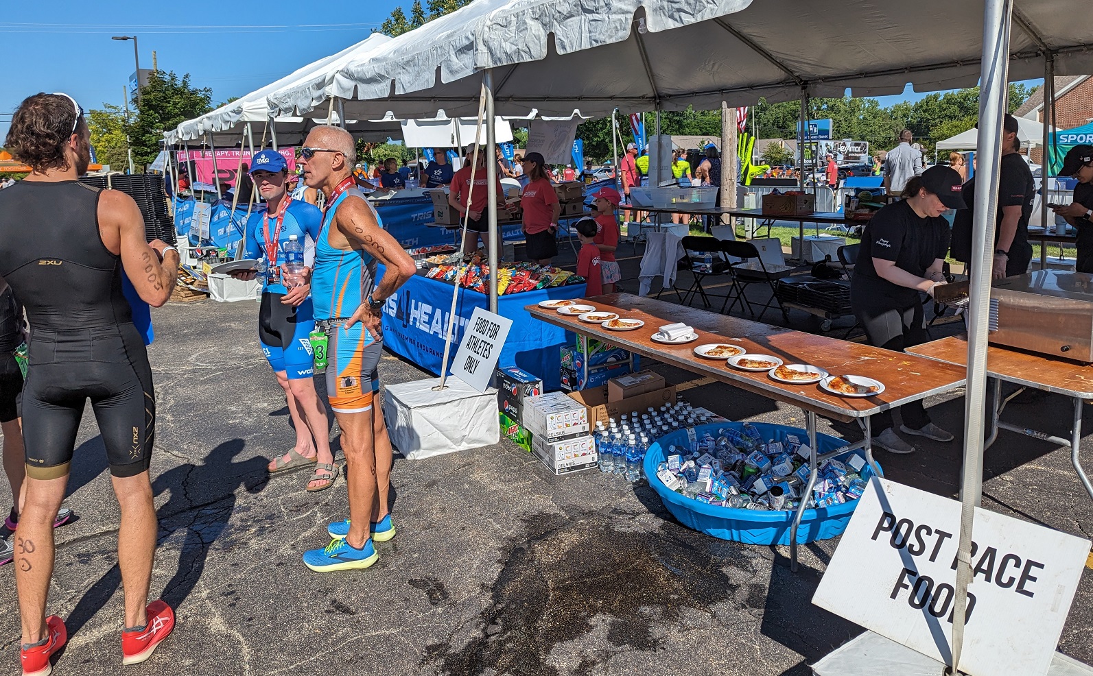 Tris4Health does a tremendous job taking care of the athletes and making sure they have a good experience. Part of that is giving them a variety of post-race food and drink, and lots of it. In addition to fruit, chips, and bagels, they offered local pizza baked right there at the finish line, and Qdoba later on for the ultra distance athletes. And there was a beer tent, too. The guy running it predicted we’d fill a 96-gallon cart with the empties – and he was right.