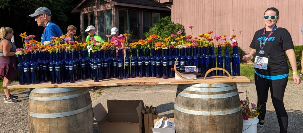 We got terrific support from the RF and vineyard staff. The finish line folks broke down and stacked the cardboard boxes from the finisher glasses and medals, and all the noshes (bread, olive oil, hummus, chocolate) were served in compostable cups. And new this year, the vineyard staff at the wine tables sorted the recycling and compostables they collected, and took care of their empty wine bottles. We ended up with just 15 bottles from various source to recycle, a big change from the dozens of previous years.