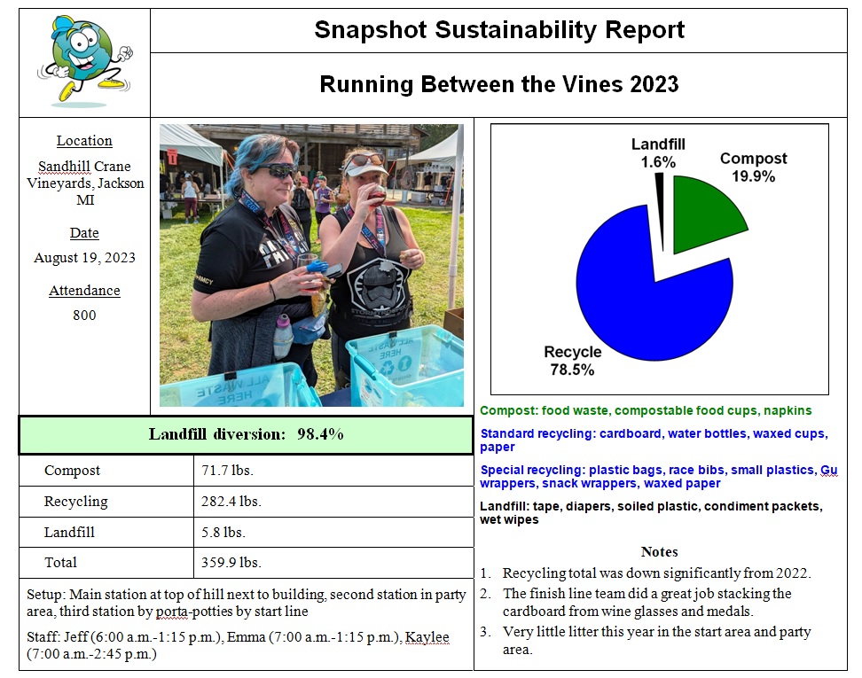 This year’s RF Events Running Between the Vines at Sandhill Crane Vineyards was notable from a Zero Waste perspective more for what didn’t happen than what did. Namely no nasty surprises, like hidden trash cans stuffed full. Everything went well, and with another large event the following day, the smooth experience was more than welcome.