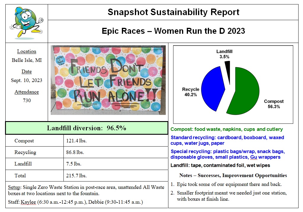 There were a couple of small issues, such as the truck collecting the aid station waste breaking down, so they bags came in rather late. But the staff helped with sorting, and by using compostable cups that went smoothly. Also many thanks to Epic for carrying our equipment there and back, as Jeff and the trailer were cleaning up at Run Woodstock. Another good year at Belle Isle!