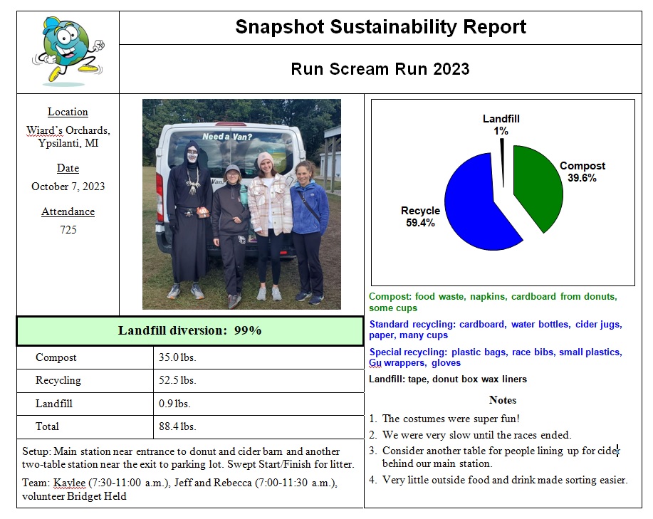 As usual, we set up Zero Waste stations at the entrance to the building where the cider and donuts are served, and another on the way to the parking lot. We policed the finish line and they brought us collected wrap from awards and other miscellaneous items. Traffic into the cider building actually went behind our tables this year, so we should consider tables on both sides next time.