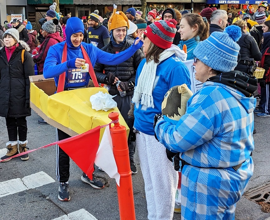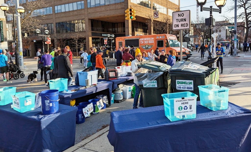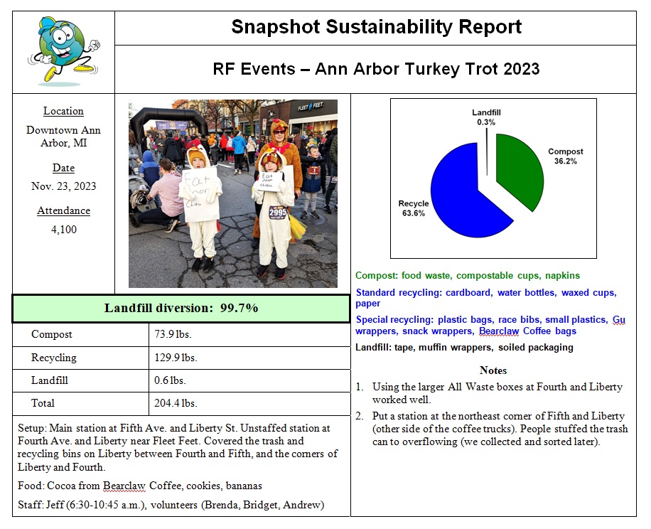 The RF Events Turkey Trot in downtown Ann Arbor on Thanksgiving morning is something like a “here and gone” event. I arrived at 6:30 a.m. to set up, the runners were off at 8:30, and we were packed up and outta there at 10:45, with Liberty Street clean and open to traffic like nothing had happened! But over 4,000 people showed up to run the one-mile and 5K, and they generated trash we had to manage quickly and responsibly.