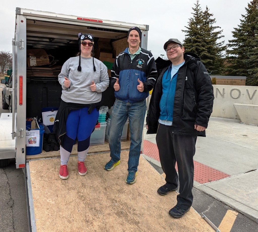 Food was Little Caesar’s pizza and breadsticks in cardboard boxes (sent to compost), and wings in foil pans. The other major contributor to waste was disposable water bottles from the finish line, with plastic wrap they were encased in. We also got a fair number of paper cups from the inside water station and the Tom’s coffee truck outside.