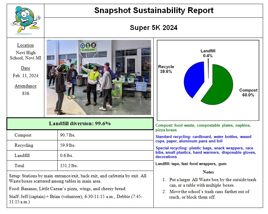 Food was Little Caesar’s pizza and breadsticks in cardboard boxes (sent to compost), and wings in foil pans. The other major contributor to waste was disposable water bottles from the finish line, with plastic wrap they were encased in. We also got a fair number of paper cups from the inside water station and the Tom’s coffee truck outside.