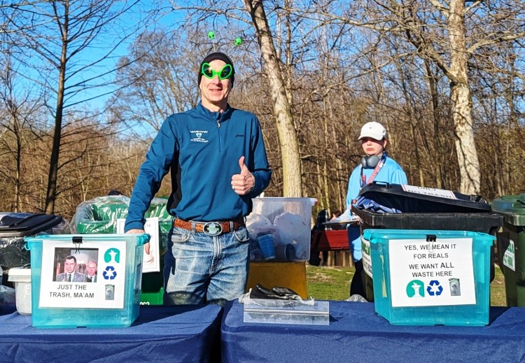 Our setup was similar to last year, with stations by the registration pavilion/starting line and next to the pancake station, and an All Waste box on the far side of the vendor area. We added one in the middle of the vendor area, where empty water bottles were being set anyway. We also put a bin with liner next to the medical station just past the finish line. A second one we put there disappeared, and we never found it. Martians?