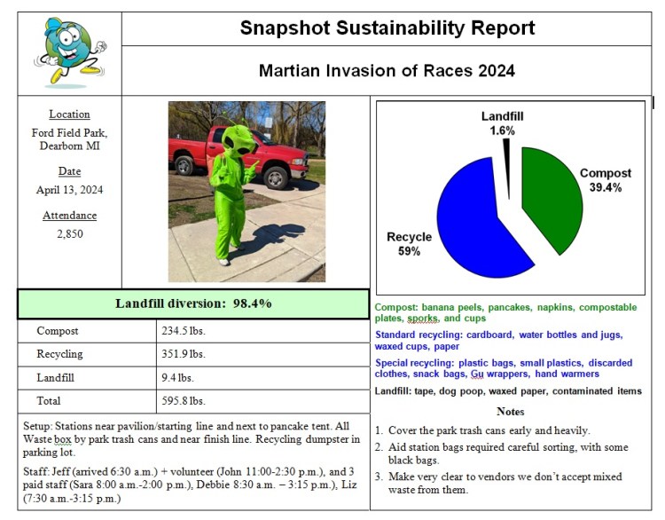 Compost and landfill were about the same as last year, but there was a big reduction in recycling, mainly from less cardboard. I’m thinking it was due to fewer T-shirts and possible fewer finisher medals. Still, we just about filled the 10-yard recycling dumpster.