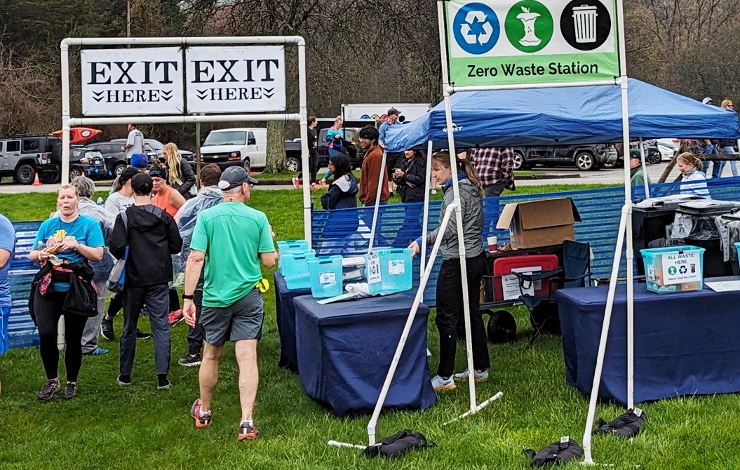 We put the main Zero Waste station by the entrance/exit to the post-race party area, where everyone had to pass if they wanted beer or coffee. During registration we set up a table outside the area with the boxes of free stuff (clothing, water bottles, etc.) and kept them there. The ultra aid station for the marathon & 50K was within sight nearby, so we left an All Waste box there and swapped it out periodically, which we also did at the beer table.